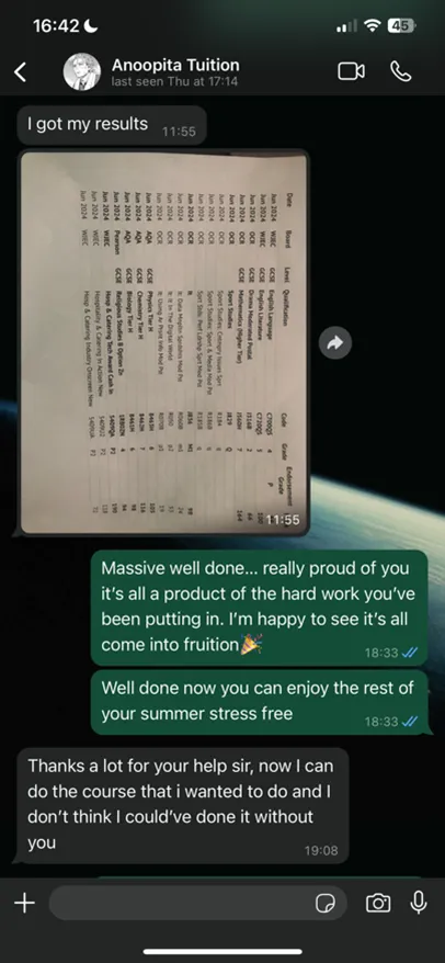 Through our time together, Anoop not only advanced to the higher-tier paper but also achieved an impressive grade 7 (equivalent to an A). Stories like Anoop’s are the reason I’m passionate about what I do—unlocking students’ full potential and guiding them to success.